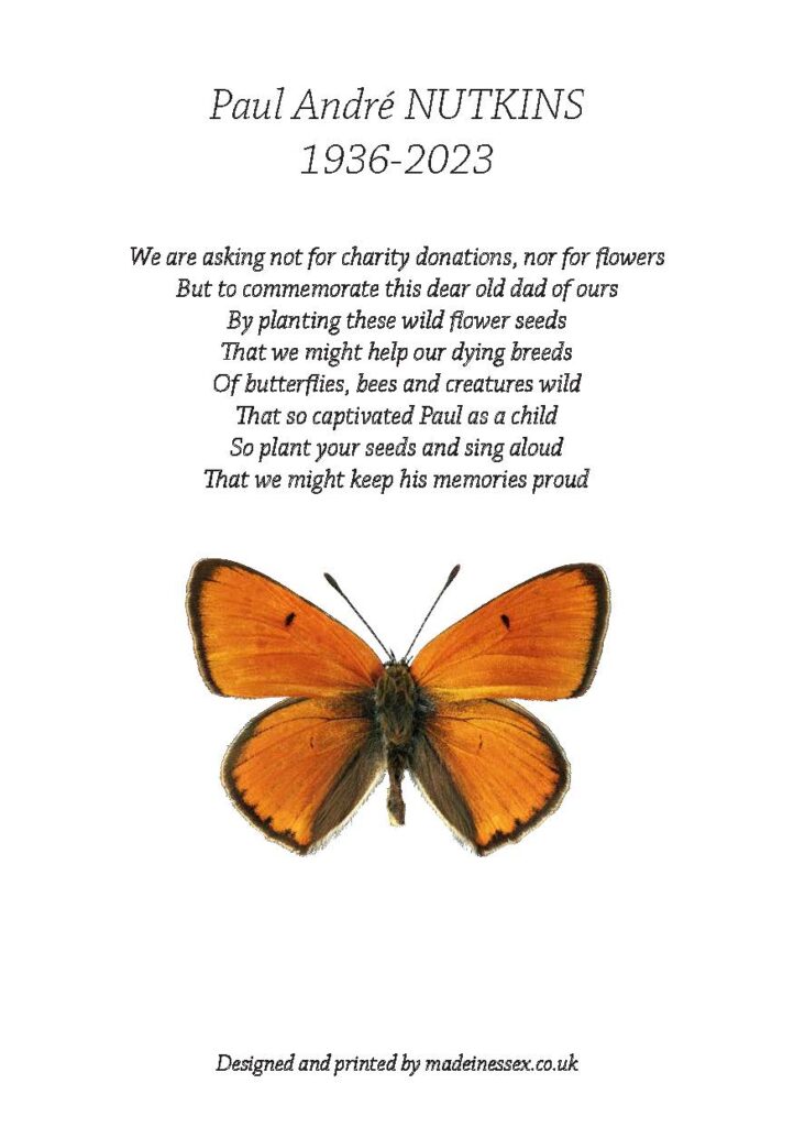 He raised several generations of the Dutch Large Copper butterfly, and set them free in the Cambridgeshire fens, where he asked us to eventually scatter his ashes.